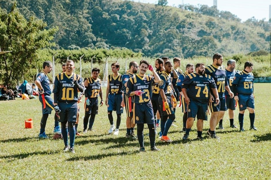 A well-structured playbook is crucial for success in 5v5 flag football, providing clarity and consistency for players and coaches. It organizes formations, plays, and strategies, ensuring everyone understands their roles. A clear playbook enhances execution, reduces confusion, and allows for quick adjustments. It also helps coaches teach concepts effectively, especially for youth players. By standardizing plays, teams can improve rhythm and efficiency, making them more competitive. A detailed playbook acts as a blueprint, guiding teams through various game scenarios and helping them achieve their goals. It’s essential for building a cohesive unit and maximizing performance on the field.