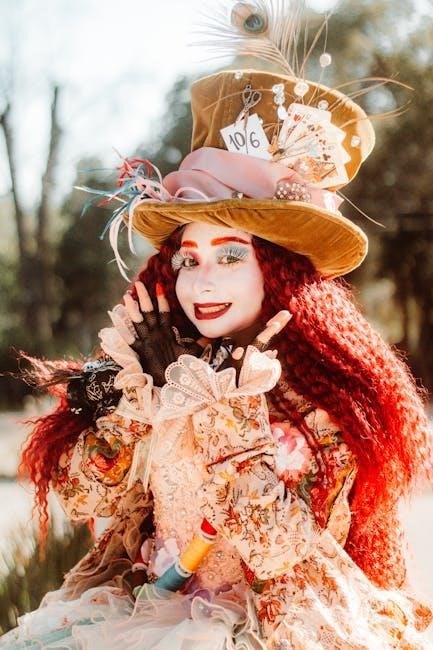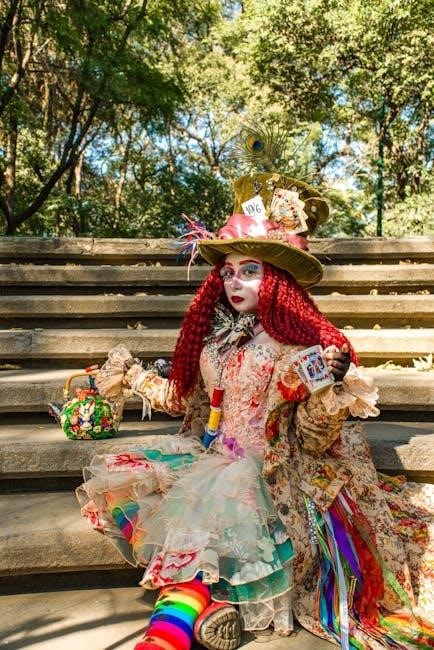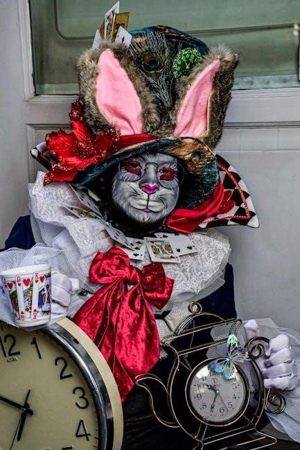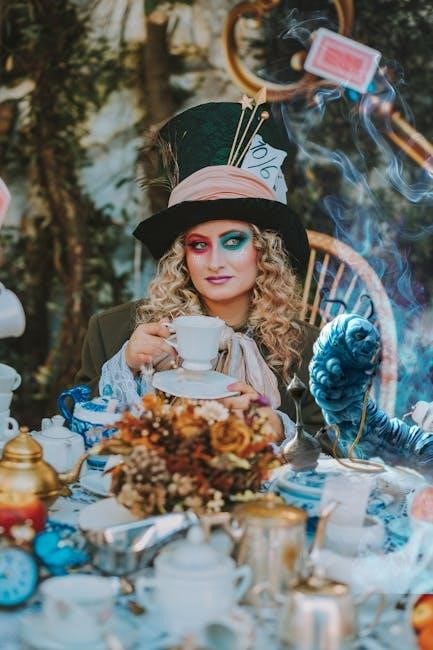 The Major Arcana cards in the Alice in Wonderland Tarot Deck are intricately linked to the story’s iconic characters and themes. Each card, such as The Fool, The Magician, and The High Priestess, is reimagined through Wonderland’s lens. The Fool represents Alice’s journey down the rabbit hole, symbolizing new beginnings and curiosity. The Magician embodies the Mad Hatter’s chaotic creativity, while The High Priestess reflects the Cheshire Cat’s enigmatic guidance. Strength might depict the White Rabbit, emphasizing time and urgency, and The Devil could symbolize the Queen of Hearts, representing authority and control. These interpretations weave the tale’s magic into tarot symbolism, offering a unique and imaginative reading experience.