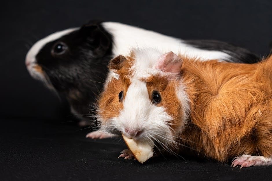 A weekly meal planner is a practical tool to ensure guinea pigs receive a balanced and varied diet. It helps owners organize daily portions of vegetables, fruits, hay, and pellets, promoting nutritional diversity. By rotating foods, the planner prevents boredom and ensures essential nutrients are consistently provided. Many PDF charts include blank meal planners, allowing customization based on a guinea pig’s preferences and dietary needs. Owners can track feeding schedules and portion sizes, ensuring a healthy mix of leafy greens, colorful vegetables, and occasional fruits. This structured approach helps maintain optimal health and prevents nutritional deficiencies. The planner also serves as a reminder to introduce new foods gradually, reducing the risk of digestive upset. With a weekly planner, owners can confidently provide a well-rounded diet tailored to their guinea pig’s needs.