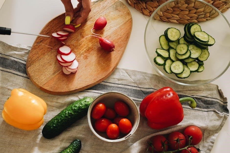 Vegetables are a cornerstone of a low-fat diet, offering essential nutrients with minimal fat. Spinach, broccoli, and carrots are excellent choices, rich in vitamins and antioxidants. Leafy greens like kale and spinach support heart health, while cruciferous vegetables like broccoli aid digestion. Bell peppers, cucumbers, and tomatoes add freshness and fiber. Opt for fresh, steamed, or roasted varieties to avoid added fats; Avoid fried or creamy sauces. Incorporating a variety of colorful vegetables ensures a balanced intake of vitamins, minerals, and fiber, supporting overall health and weight management. These options are naturally low in fat and calorie-dense, making them ideal for a low-fat diet.