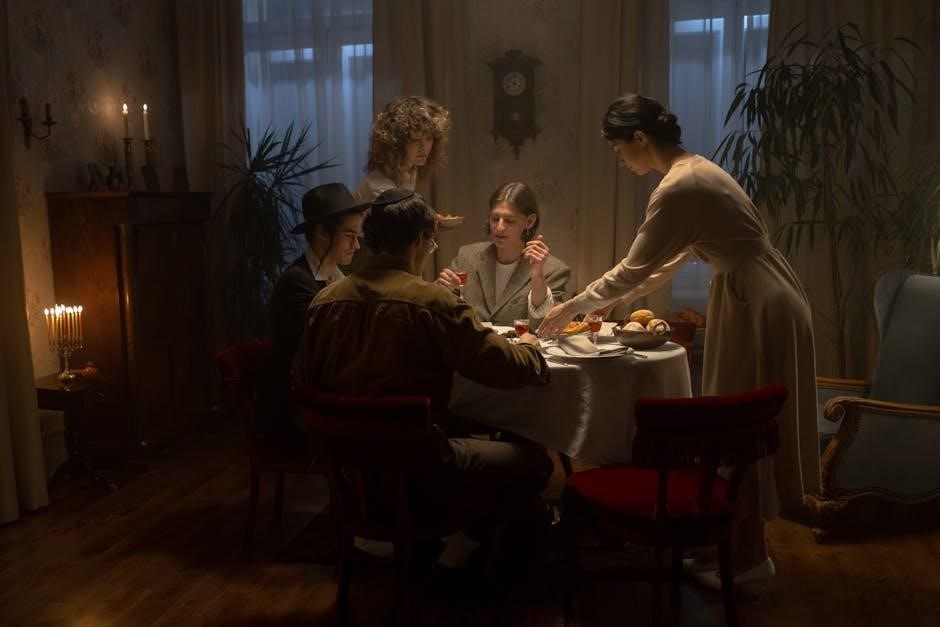 Using a digital Haggadah during Seder offers convenience and accessibility․ Ensure all participants have access to the PDF on their devices beforehand․ Consider using a shared screen or projecting the Haggadah for group viewing․ Zoom in on texts for better readability, especially for those with vision challenges․ Pre-download the PDF to avoid internet interruptions․ Use bookmarks or tabs to navigate easily between sections․ Encourage participants to highlight or annotate digitally for personal reflection․ Charge devices in advance and have backup power sources ready․ Balance technology use with tradition to maintain the Seder’s spiritual focus․ These strategies ensure a seamless and engaging experience while preserving the essence of the Passover tradition․