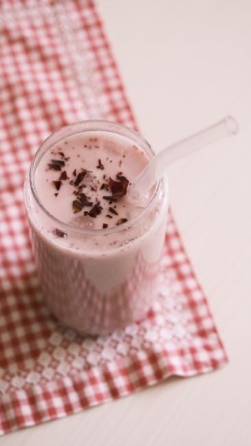 Milkshakes are indulgent, creamy treats that combine ice cream, milk, and flavorings like chocolate, strawberry, or vanilla. They can be made without ice cream for simplicity, using ingredients like whole milk, half-and-half, and flavored powders. These thick, velvety drinks are perfect for satisfying sweet cravings or as a refreshing summer beverage. The Shakes Recipes PDF includes classic and creative milkshake recipes, such as high-calorie options with malted milk powder or protein-packed versions. Whether you prefer traditional flavors or unique twists, milkshakes offer endless customization, making them a delightful choice for any time of day. They’re also great for special treats or desserts.