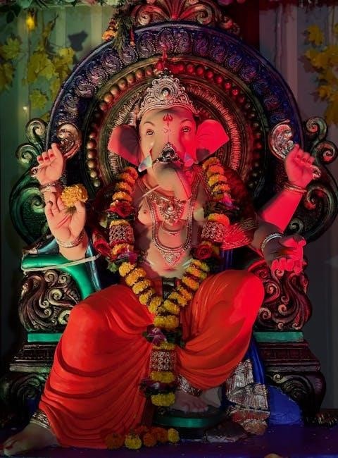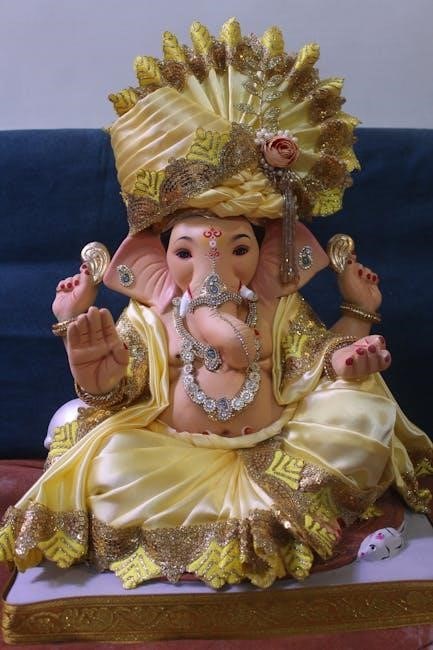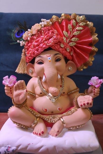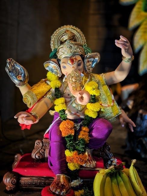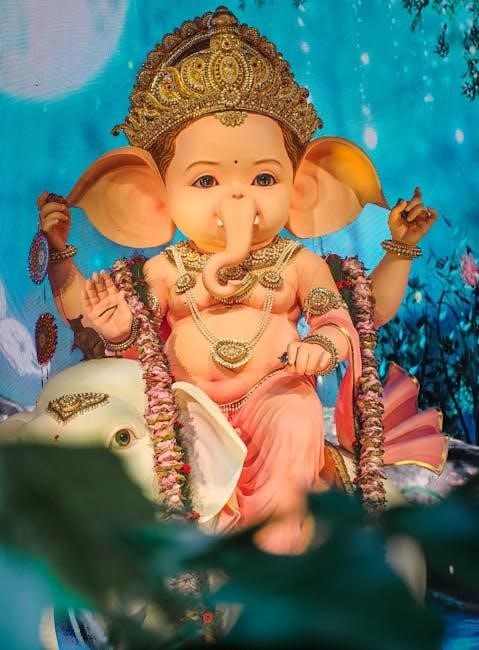 The Vinayaka Ashtothram Telugu PDF features 108 sacred names of Lord Ganesha, each imbued with deep spiritual significance. These names, known as the Ashtottara Shatanamavali, are a collection of epithets that praise Ganesha’s divine attributes, roles, and powers. Each name reflects a unique aspect of his personality, such as “Gajananaya” (elephant-headed) and “Vighnavinayaka” (remover of obstacles). Chanting these names is believed to invoke Ganesha’s blessings, bringing prosperity, wisdom, and spiritual growth. The Telugu version of the Ashtothram is widely revered for its accessibility and cultural resonance, making it a popular choice for devotees seeking to connect with the deity through heartfelt recitation.